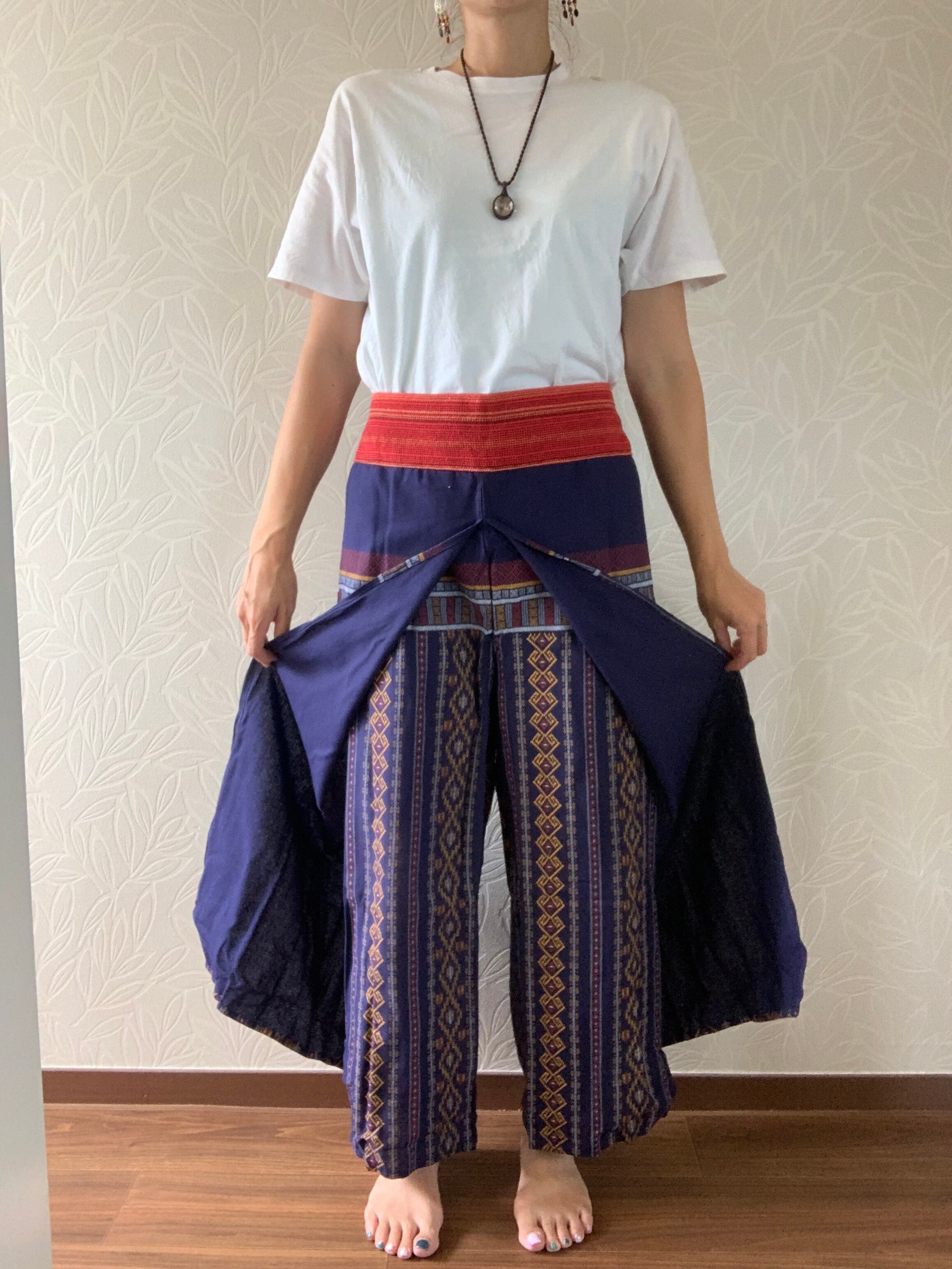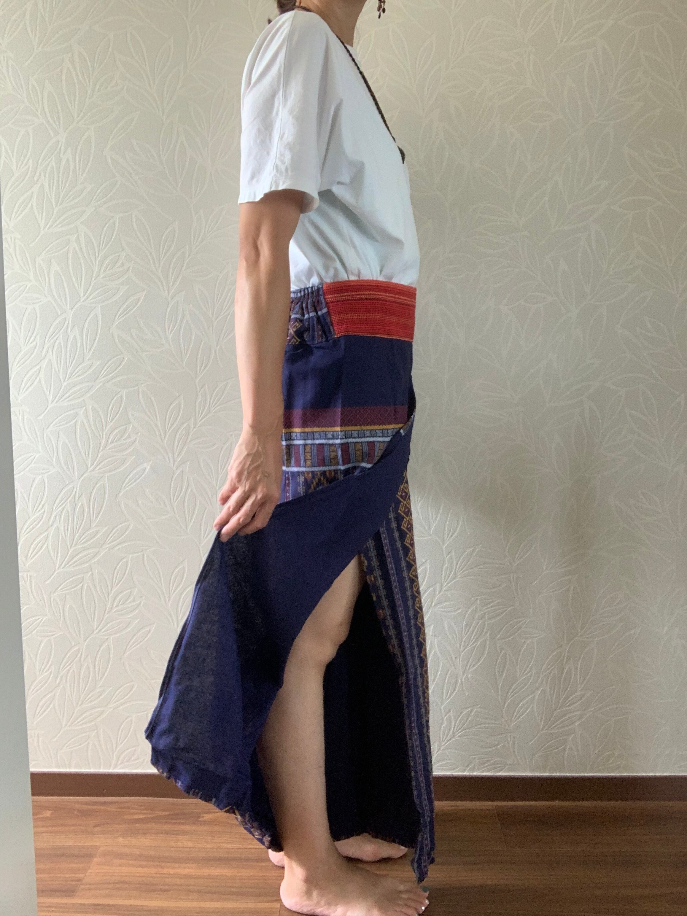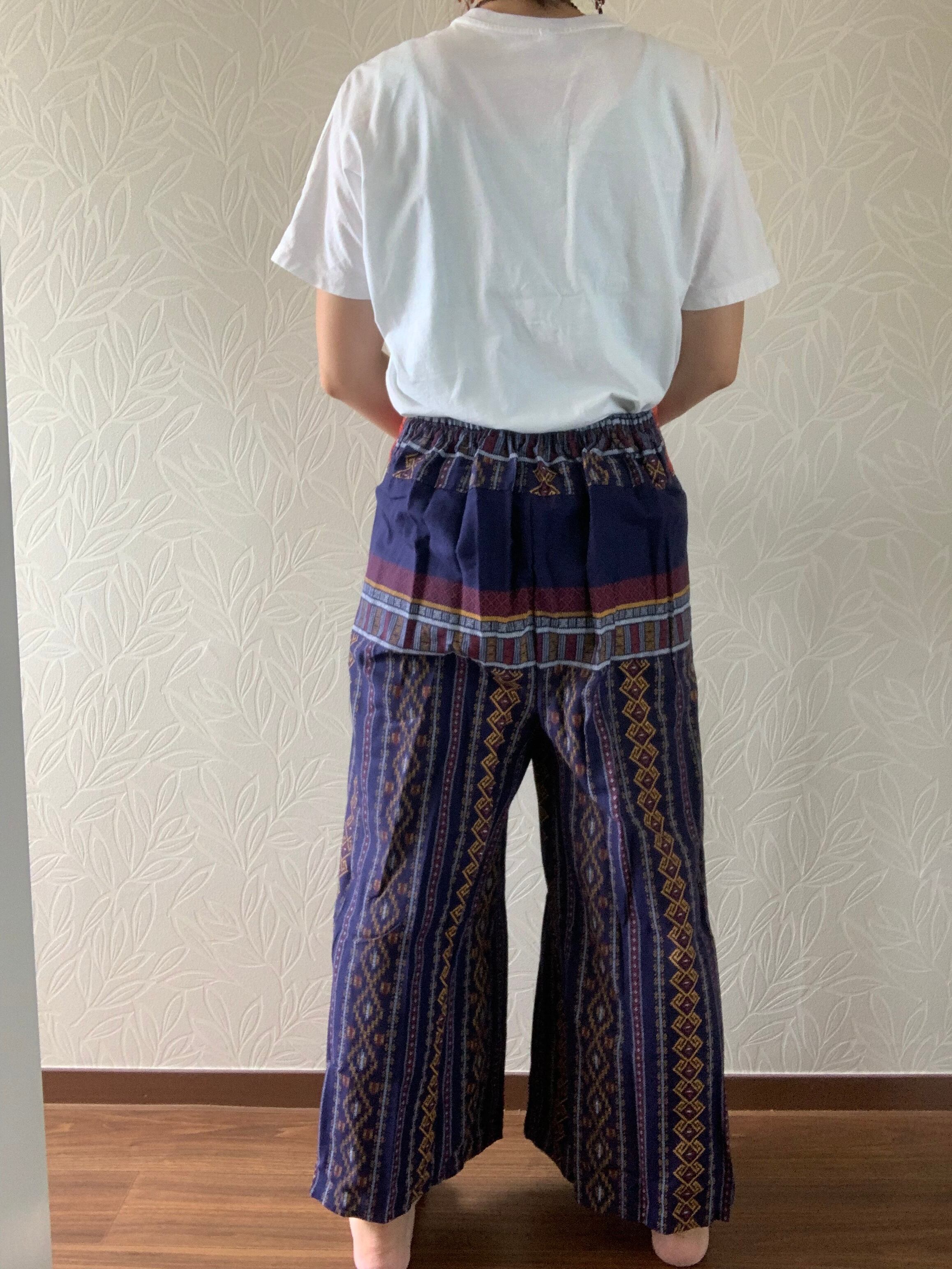 両脚のサイドは縫い付けておらず、たっぷりとした布で巻いてあるデザインです。動きによって脚が見え隠れし、風も入るので涼しく着れます。