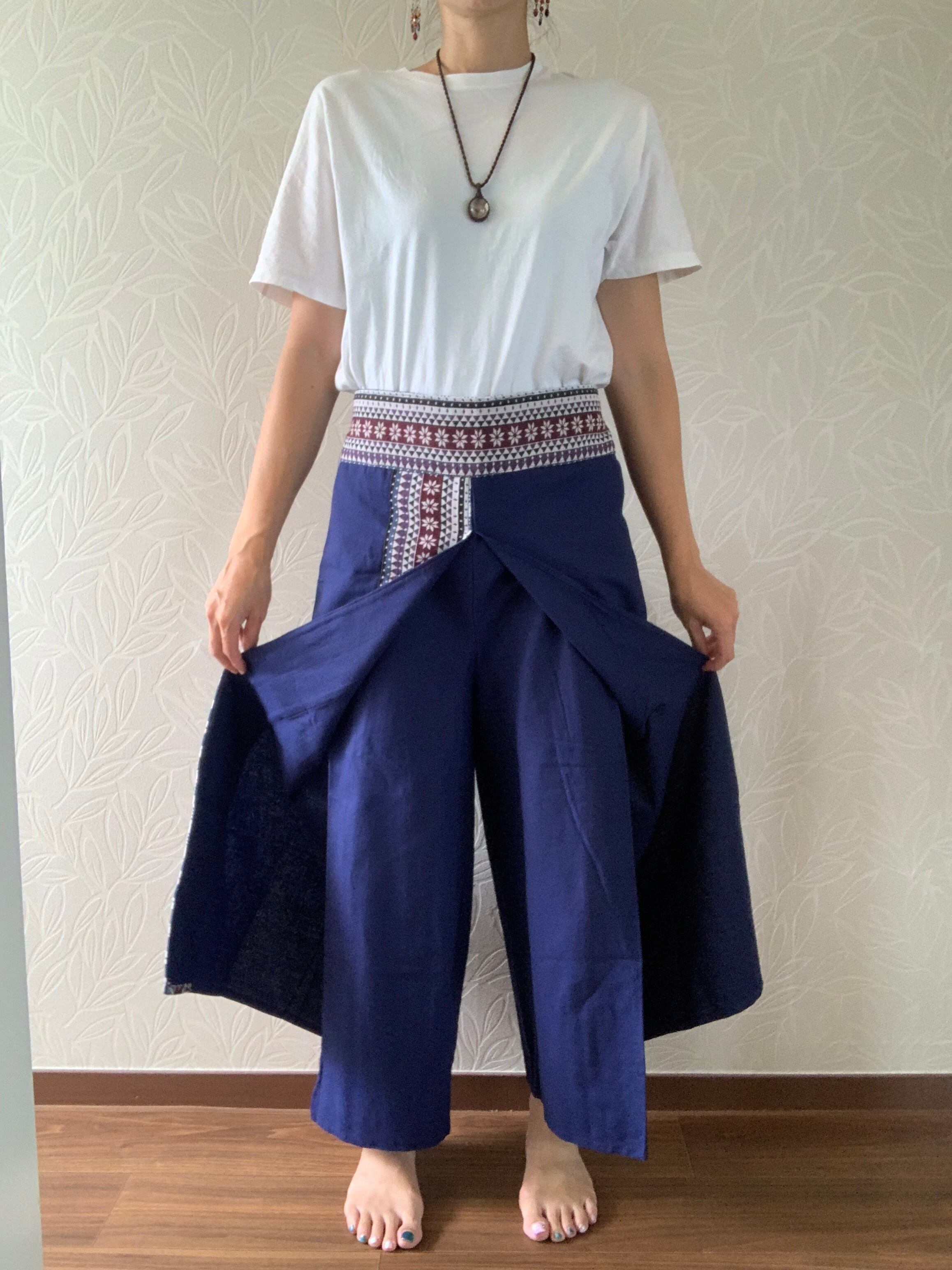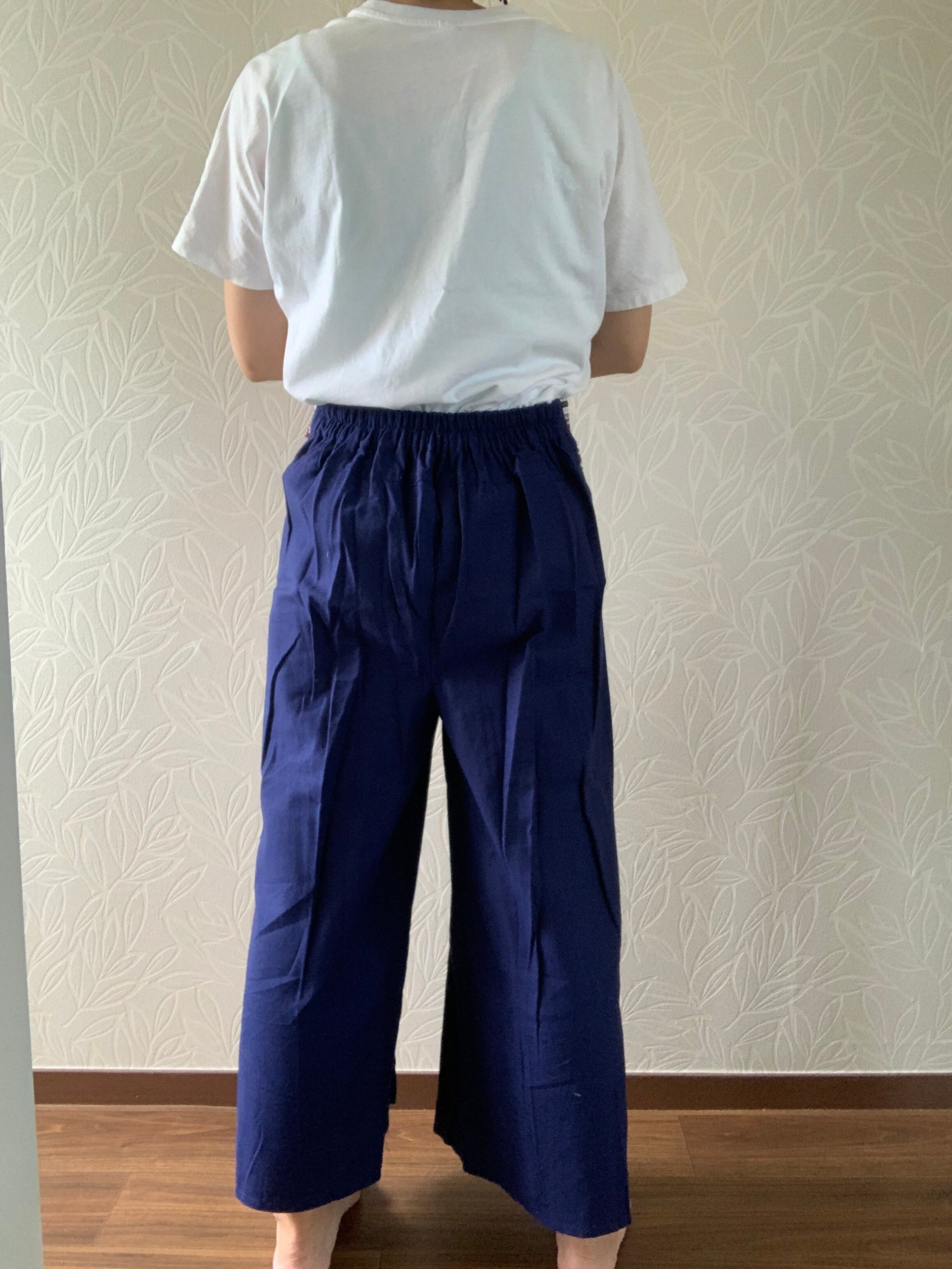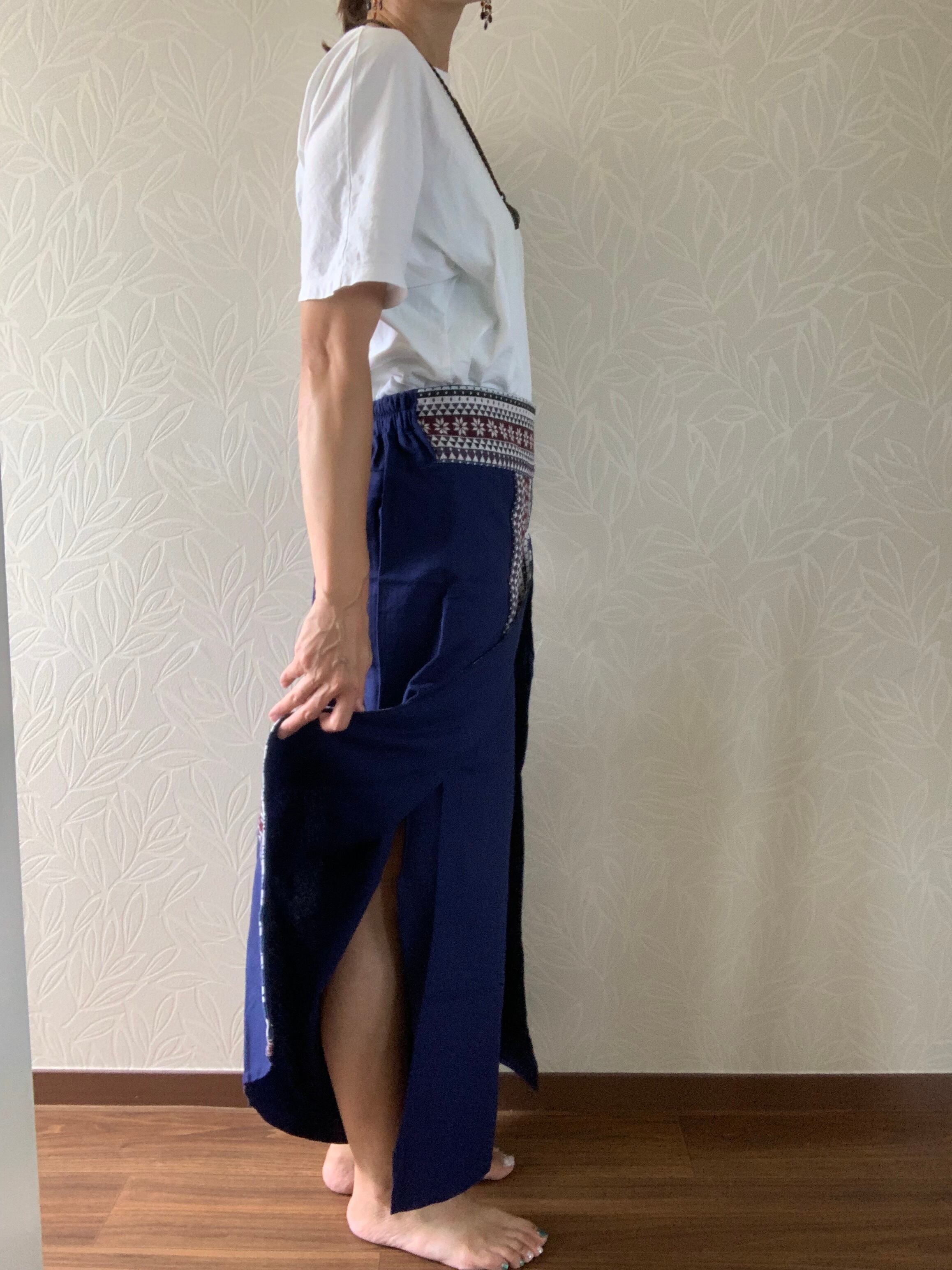 両脚のサイドは縫い付けておらず、たっぷりとした布で巻いてあるデザインです。動きによって脚が見え隠れし、風も入るので涼しく着れます。