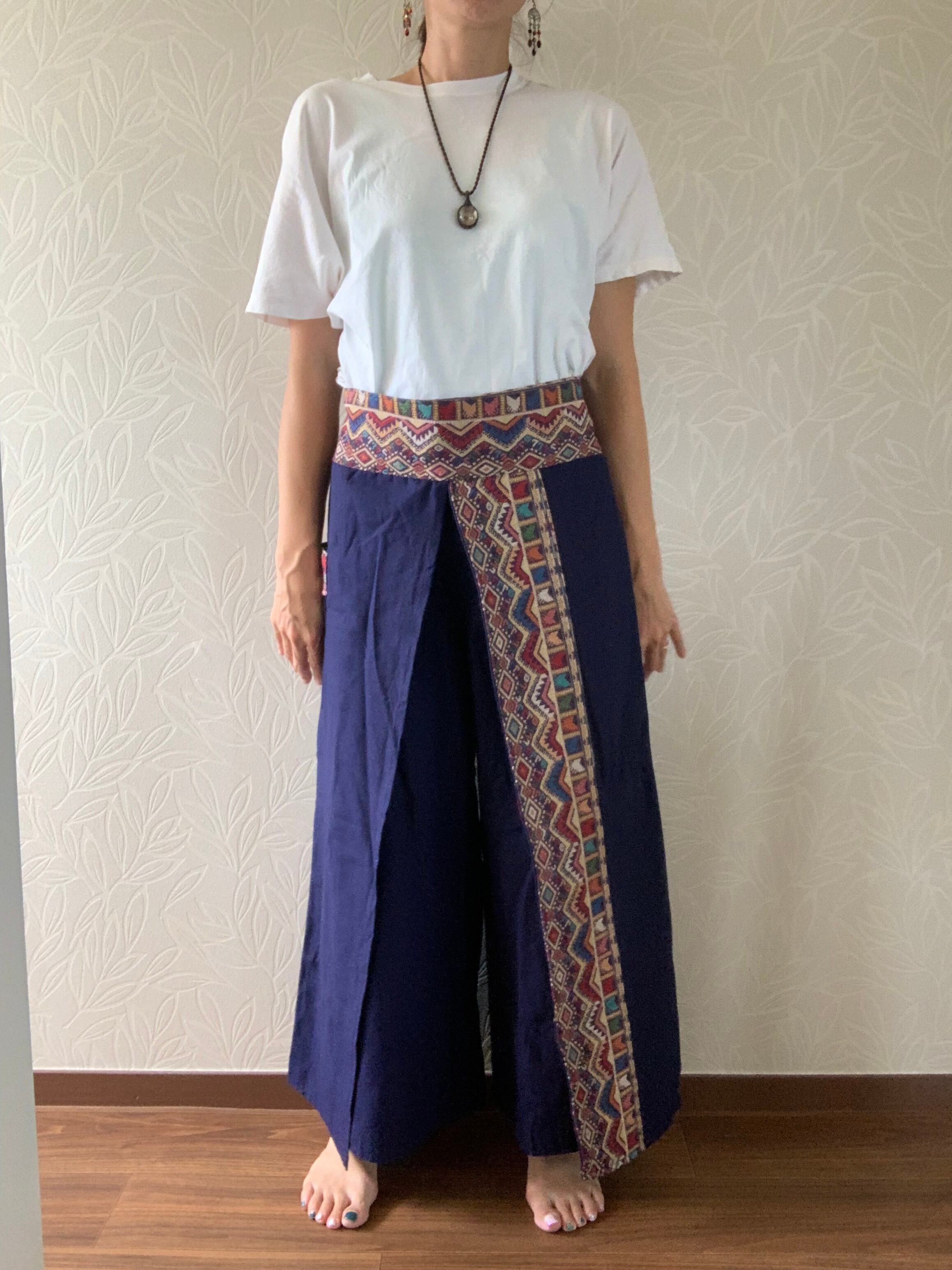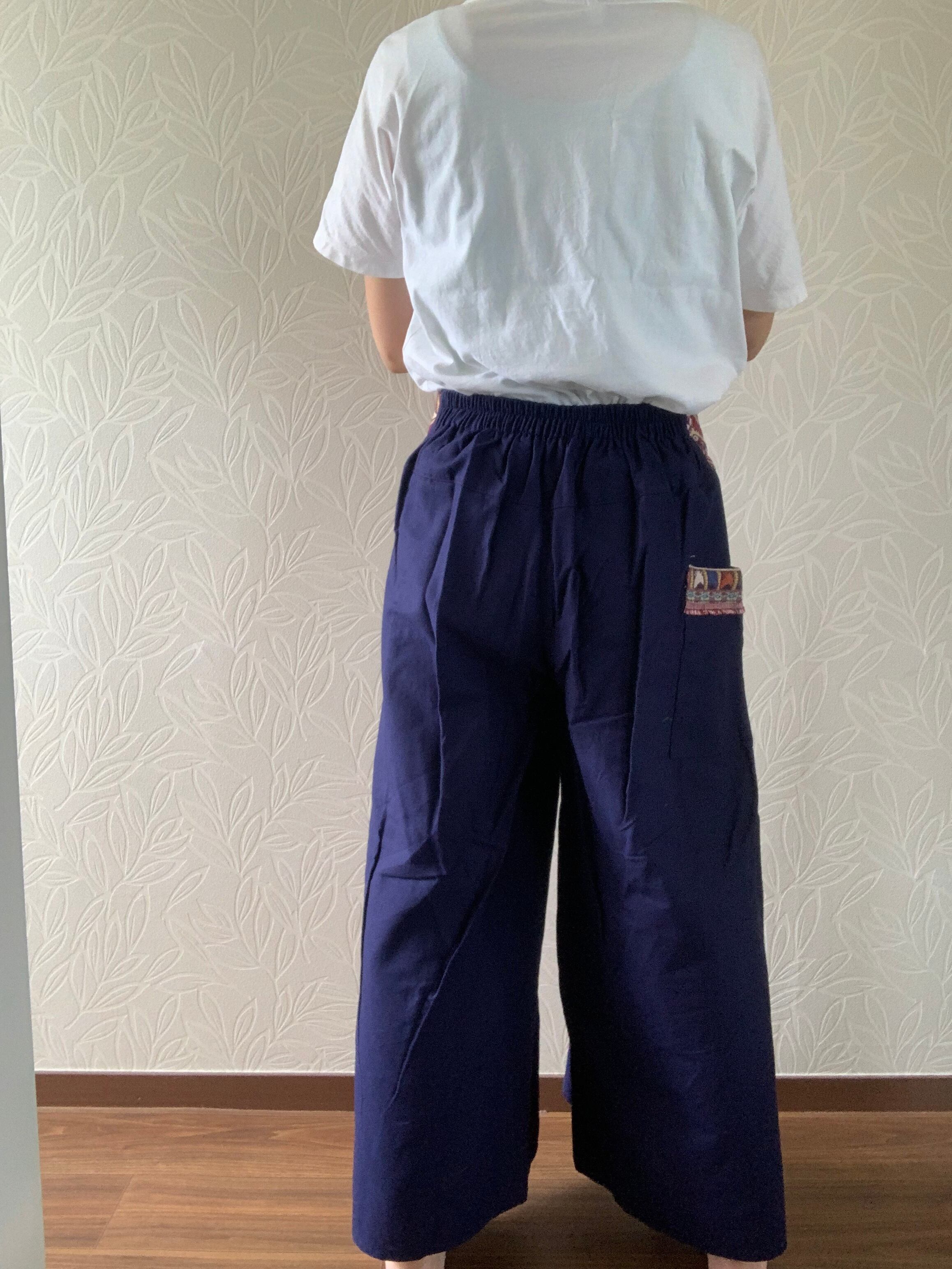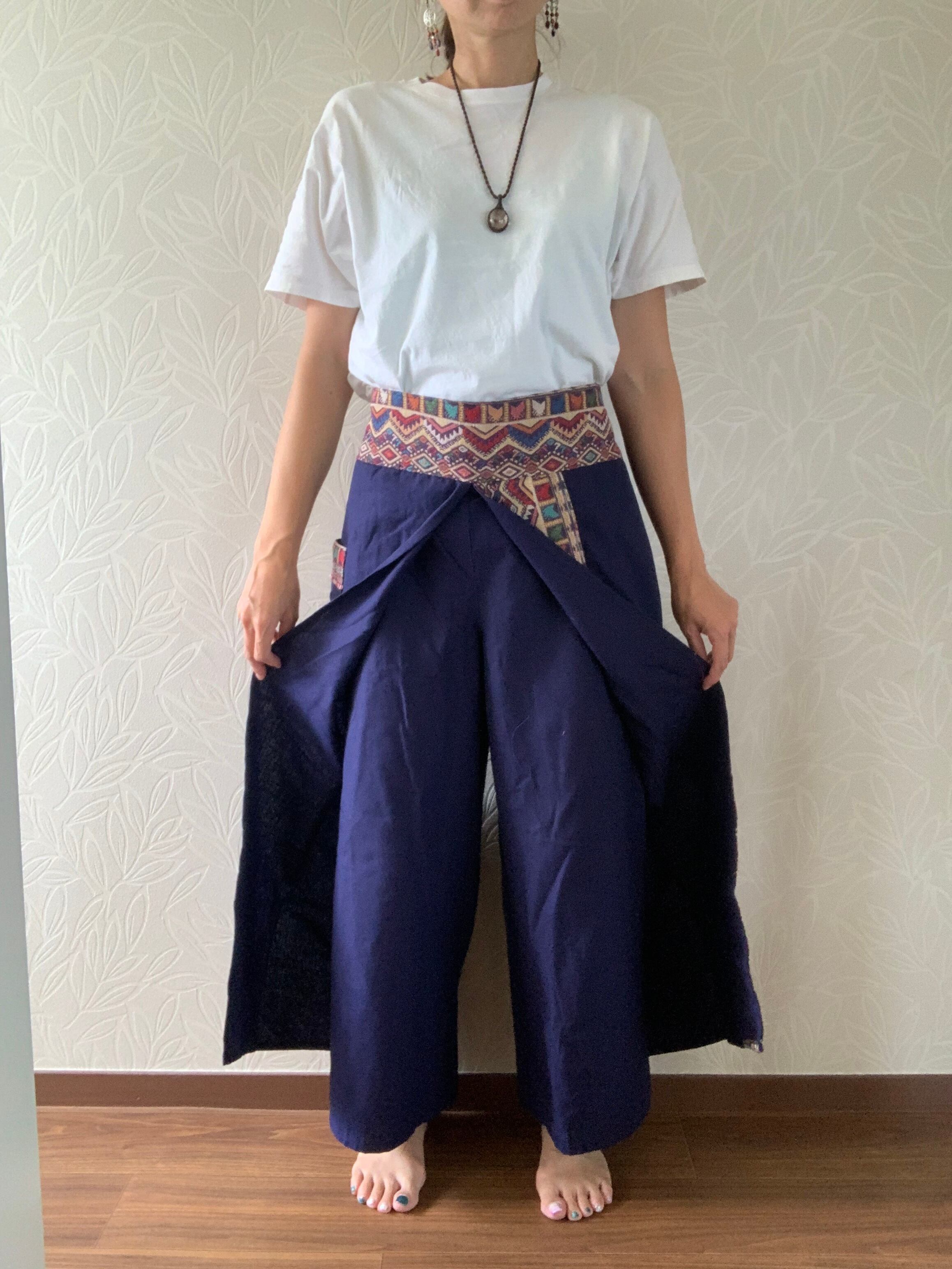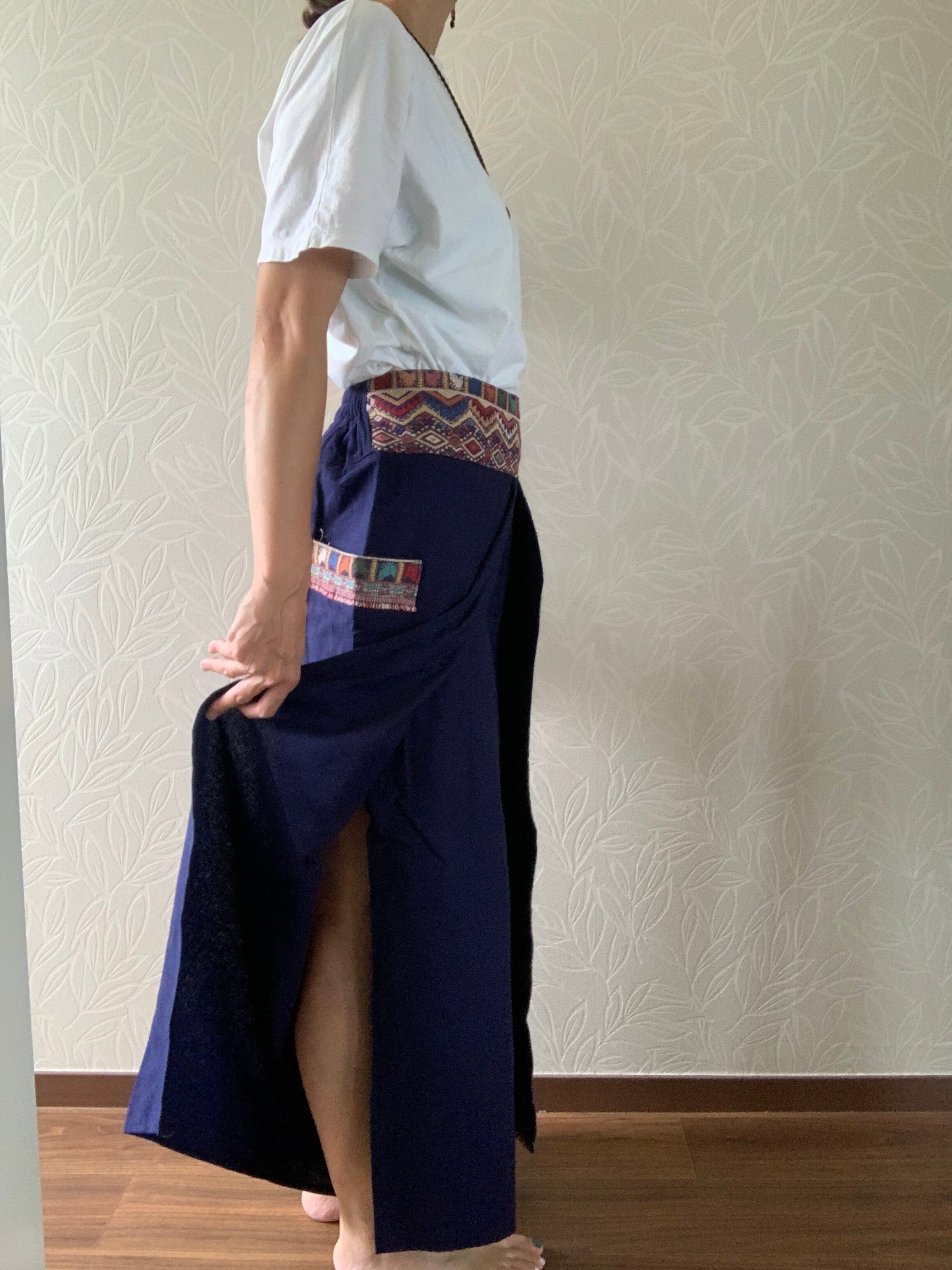 両脚のサイドは縫い付けておらず、たっぷりとした布で巻いてあるデザインです。動きによって脚が見え隠れし、風も入るので涼しく着れます。