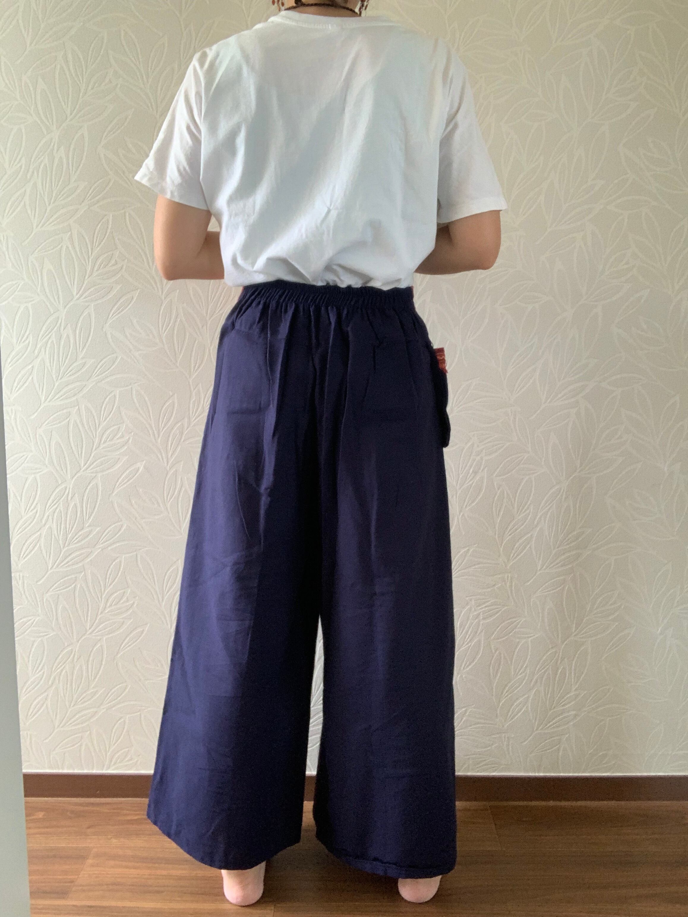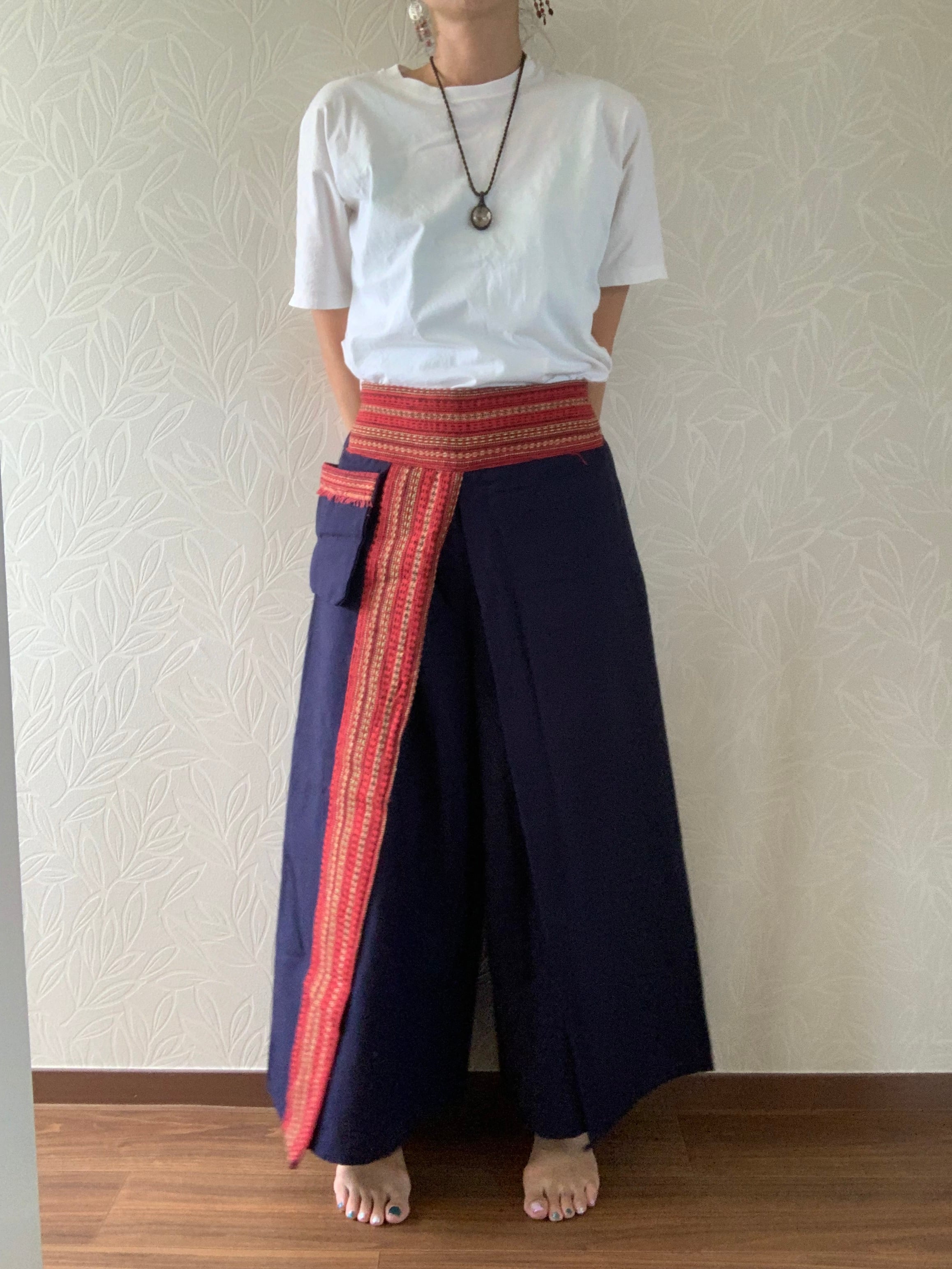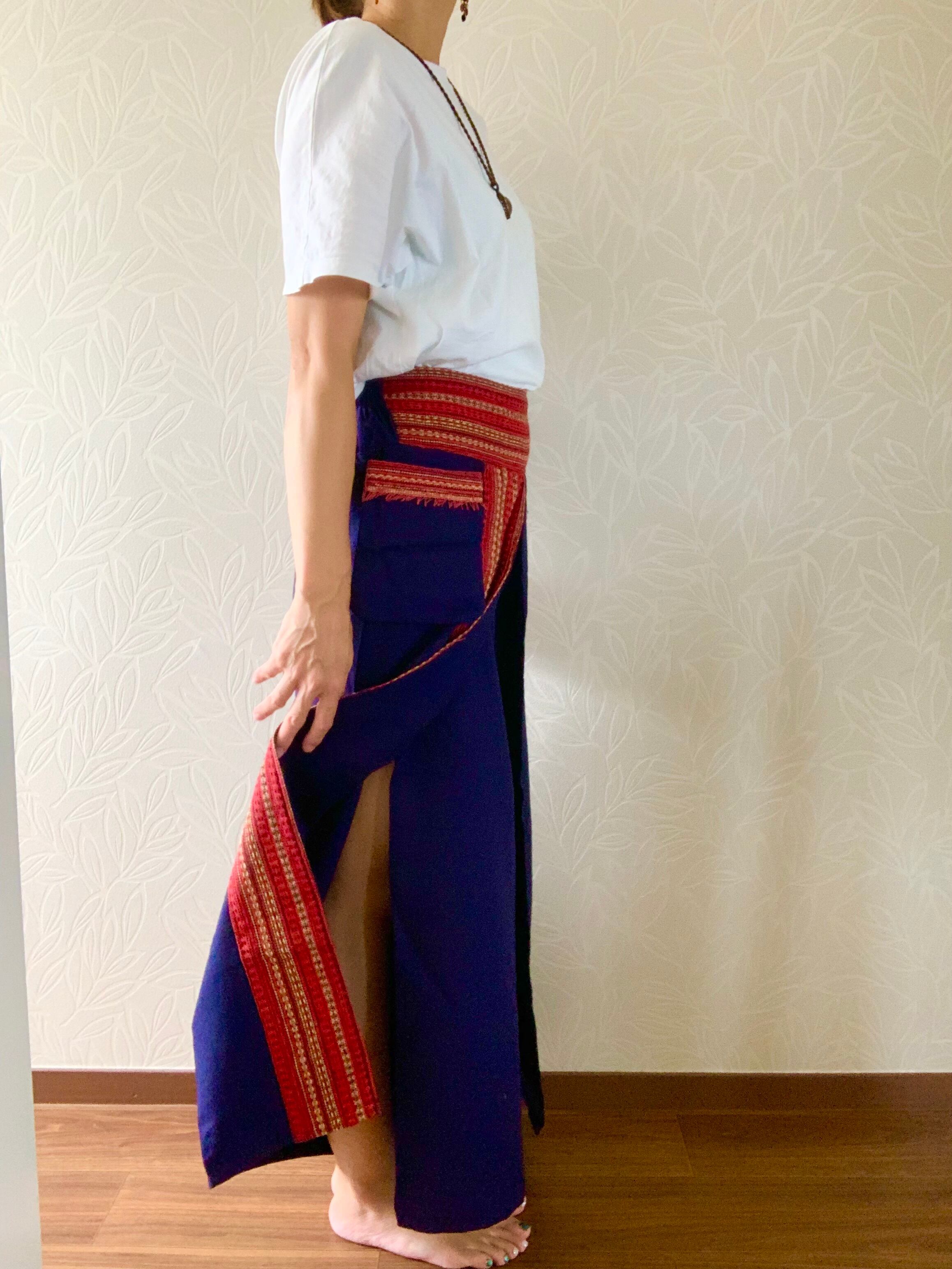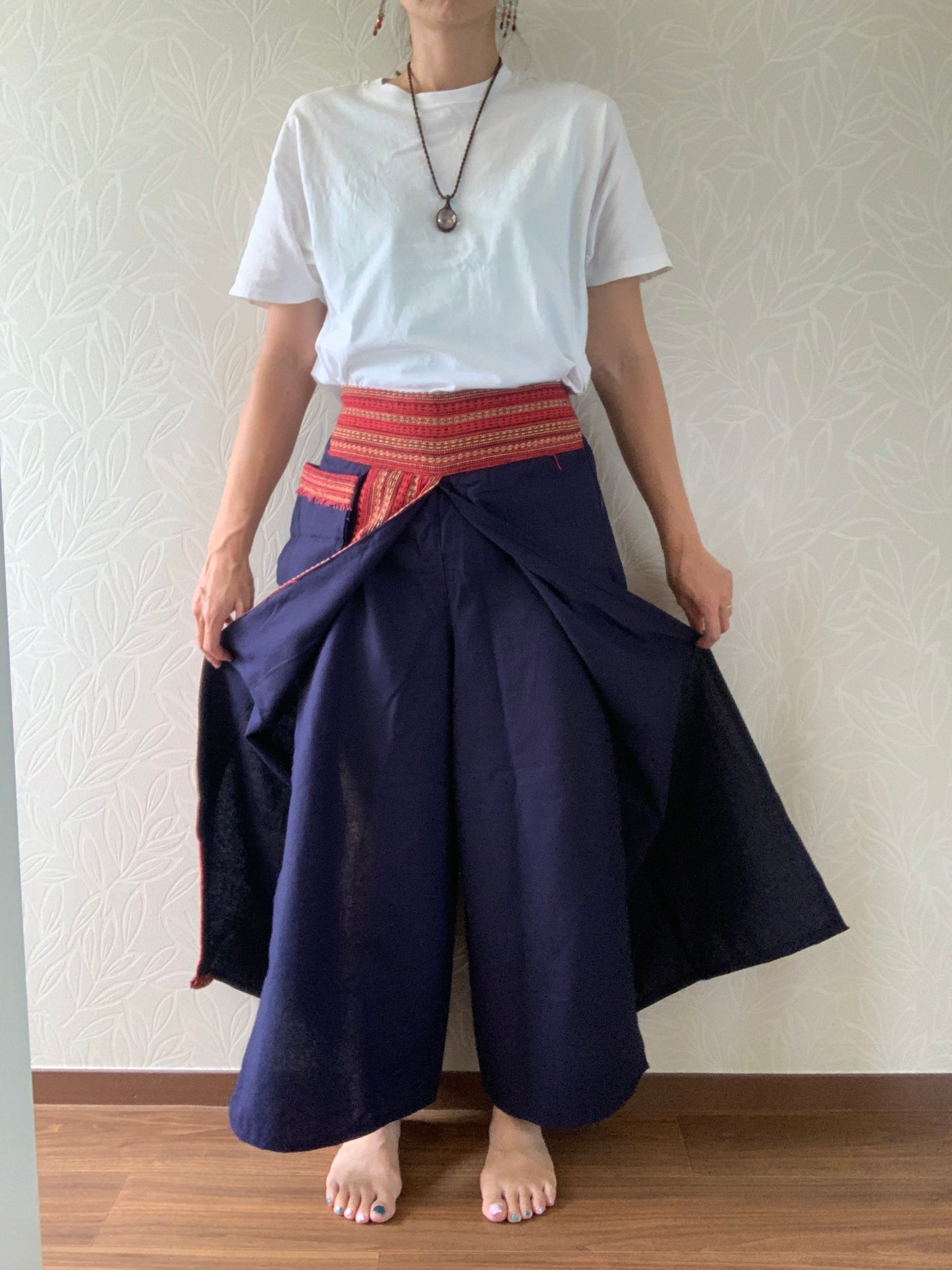 両脚のサイドは縫い付けておらず、たっぷりとした布で巻いてあるデザインです。動きによって脚が見え隠れし、風も入るので涼しく着れます。